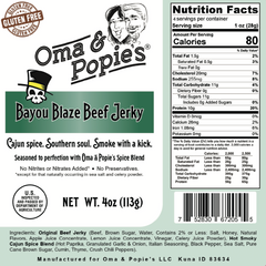 Sink your teeth into the soul of the South with Bayou Blaze, Oma & Popie’s bold Hot Smoky Cajun beef jerky. Made with premium cuts of tender beef and seasoned with a rich blend of smoky paprika, garlic, crush chilli peppers and authentic Creole spices, this jerky brings that unmistakable Louisiana heat in every bite. It’s gluten-free, slow-marinated, and crafted for those who crave flavor that dances on the edge of fire.
